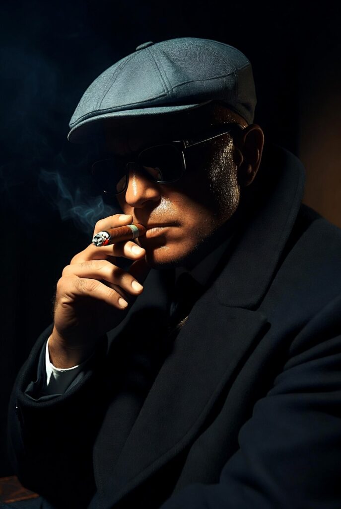 In one corner, a man lounged in an armchair. He wore a flat cap pulled low, dark glasses concealing his eyes, and a black coat despite the chill in the air. A cigar dangled from his lips, and he kept wiping beads of sweat from his forehead with a handkerchief.